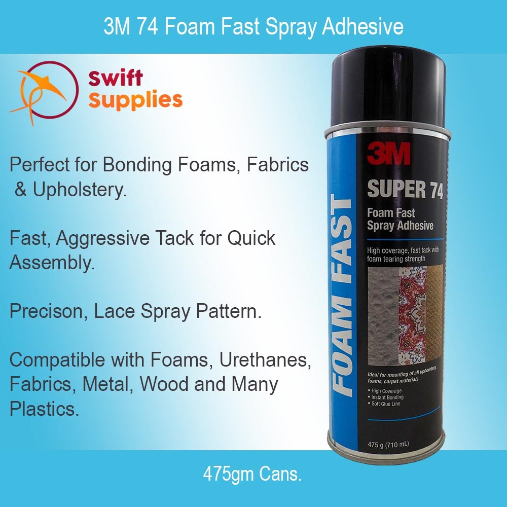 3M 74 Foam Fast Spray Adhesive has been specially engineered for bonding foams and fabrics. This adhesive spray is extremely fast tacking and creates soft bond lines.