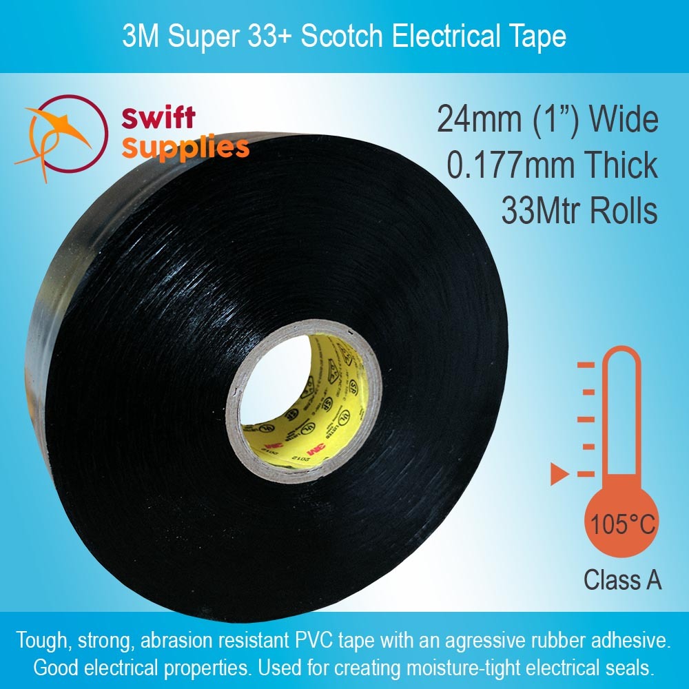 3M Super 33+ Scotch Electrical Tape is black and able to withstand temperatures between -18°C and 105°C. It has a total thickness of 0.177mm.