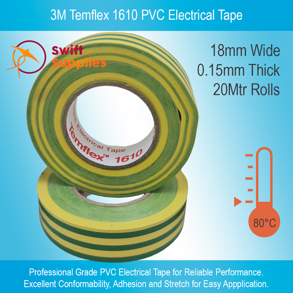 3M Temflex 160 PVC Electrical Tape is a very high quality grade of PVC electrical tape that embodies the quality for which 3M is known. This tape is highly conformable and can be easily applied in tight wraps to all kinds of shapes and surfaces. It uses a vinyl backing and is available in a selection of bright and distinct colours.