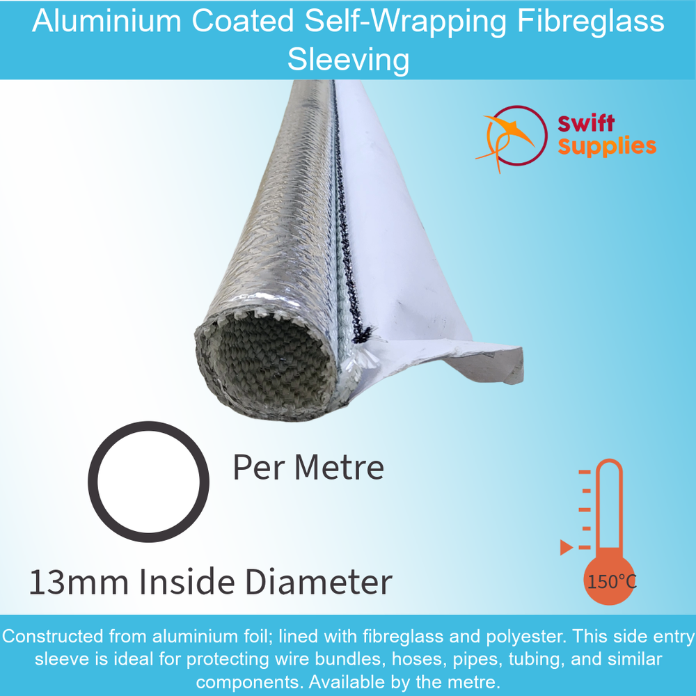 Our Aluminium Coated Self-Wrapping Fibreglass Sleeving is constructed from aluminium foil; lined with fibreglass and polyester. This side entry sleeve is ideal for protecting wire bundles, hoses, pipes, tubing, and similar components. Its 25% self-adhesive overlap, self-closing design, allows for quick and easy installation over existing cable harnesses.