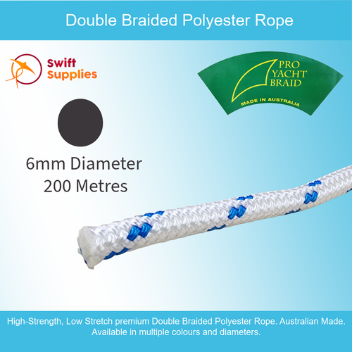 Our Double Braided Polyester Rope, also known as Yacht Braid, is Australian Made. This UV resistant, high strength, low stretch rope is mainly used in the marine sector for mooring and anchor lines, pulling, rigging or hoisting applications. This rope is also used for animal leads in the equestrian environment.