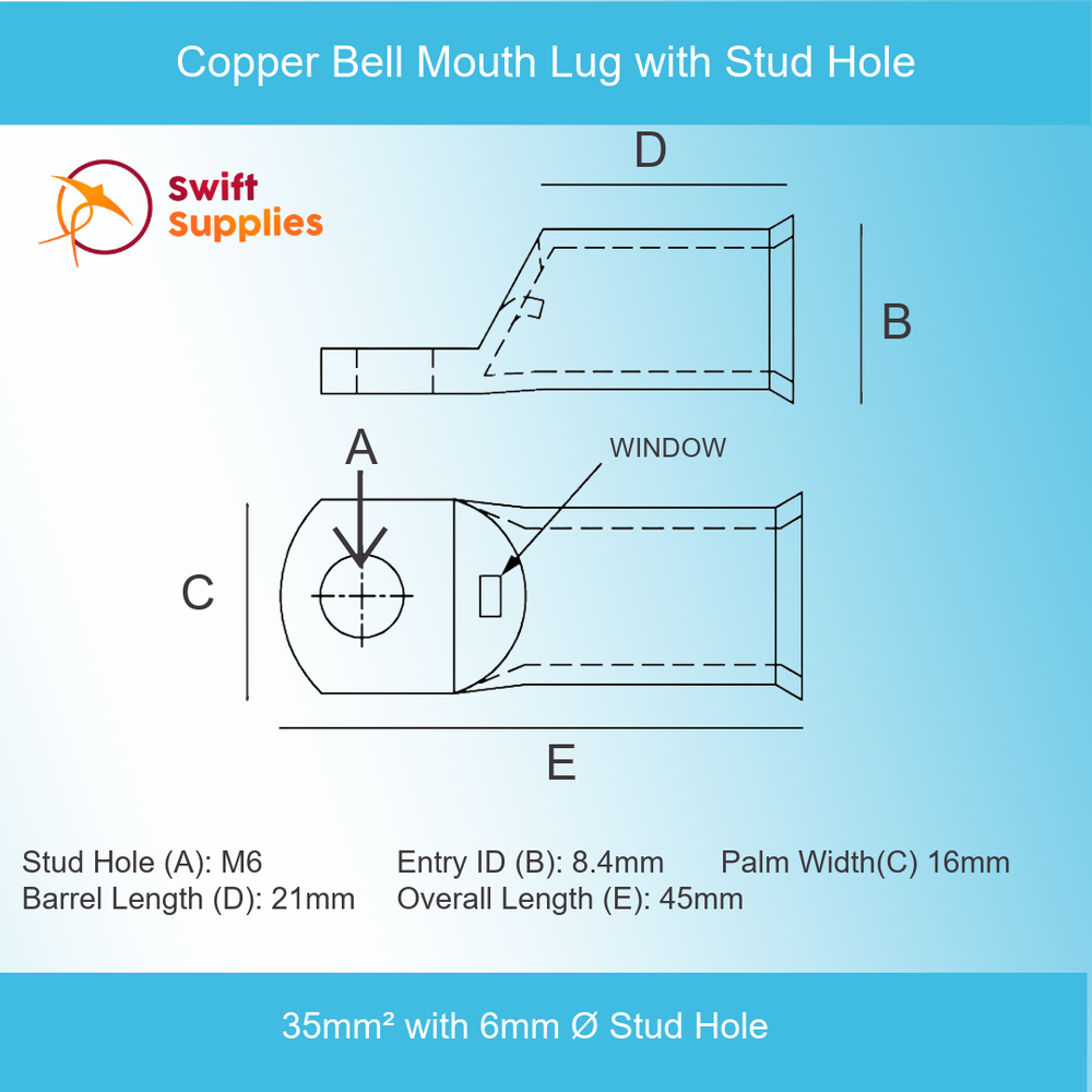 Copper Bell Mouth Cable Lugs - 35mm² with 6mm Ø Stud Hole