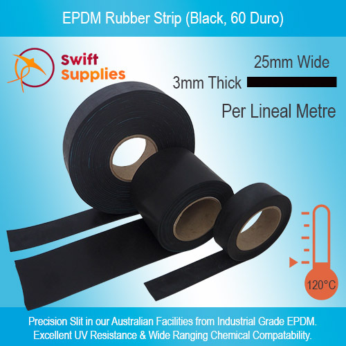 EPDM Rubber Strips are precision slit, non-adhesive rolls or EPDM Rubber cut in our Australian facilities. The rubber strips offered on this page are all cut from our industrial-grade, solid EPDM Rubber Sheet (60 Duro). This grade is sulphur cured, has wide ranging chemical resistance, and outstanding UV resistance.