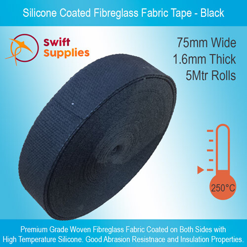 Silicone Coated Fibreglass Fabric Tape - 1.6mm Thick x 75mm Wide x 5 Metres Long, Black