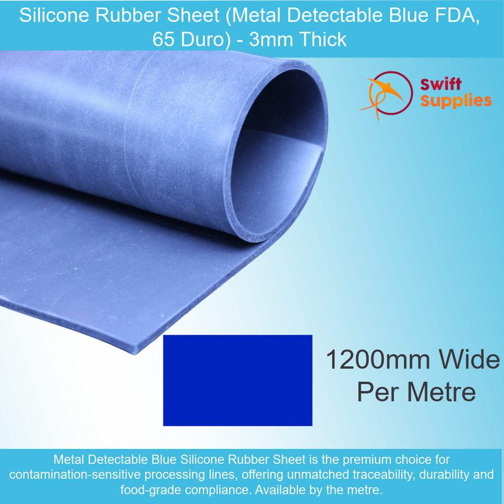 Silicone Rubber (Metal Detectable, Blue, 60 Duro) - 3mm Thick x 1200mm Wide (Per Metre)