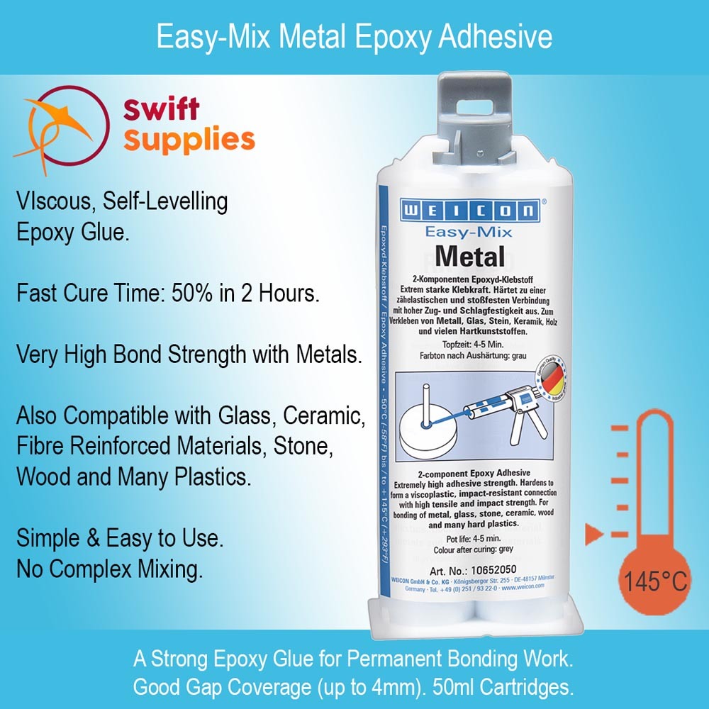 Our Easy-Mix Metal is a professional-grade epoxy adhesive designed especially for bonding metal parts. This quality glue is manufactured by Weicon in Germany and uses their Easy-Mix dosing system.